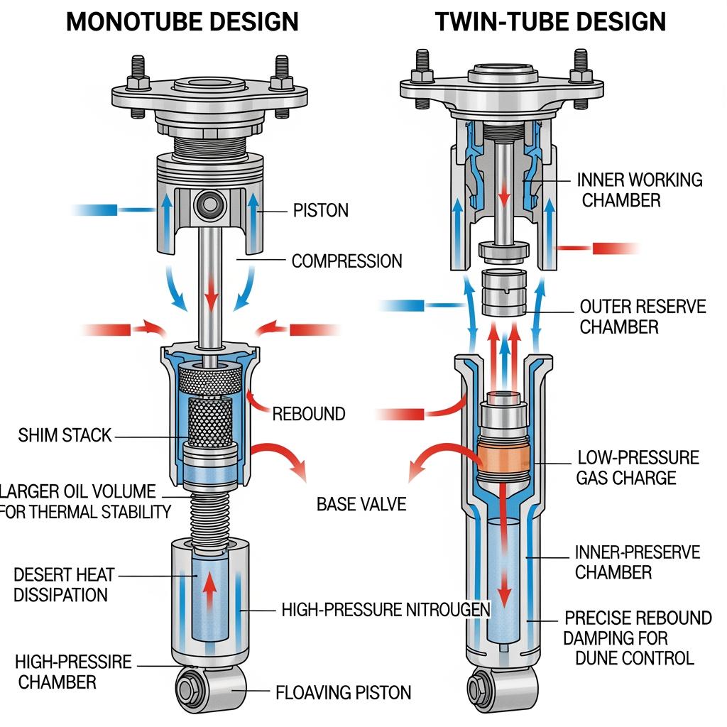 Dune accessStrong rebound, load-assist rears, high-flow pistonsImproved cresting and recoveryWheel hop and traction loss