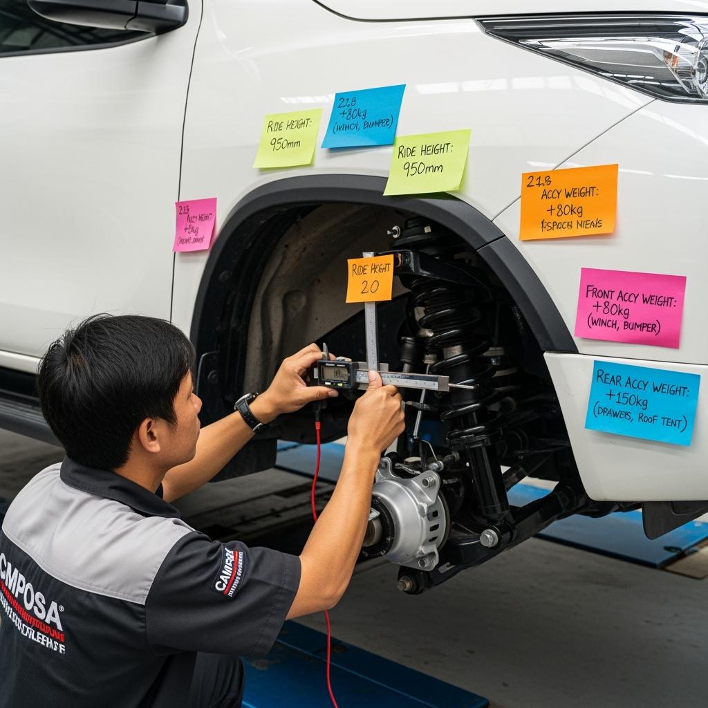 قبل الالتزام، قيس ارتفاعات الركوب الثابتة والمحملة، وأوزان الزوايا، وكتلة الإكسسوارات (حواجز الثيران، رافعات، رفوف السقف، أدراج). تحدد هذه المدخلات معدلات النوابض وحملها ليحافظ coilover الخاص بك على الهندسة الأصلية ويبقي المحاذاة ضمن المواصفات.