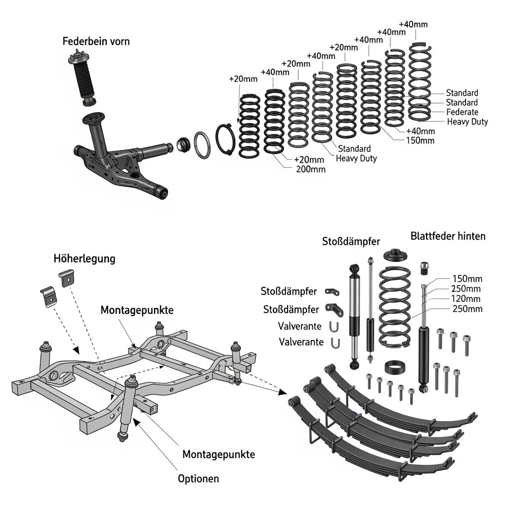 - Specify load and lift → confirm ABE/Teilegutachten → verify axle loads → align and headlight-aim check post-fit → schedule 1,000 km re-torque and inspection.