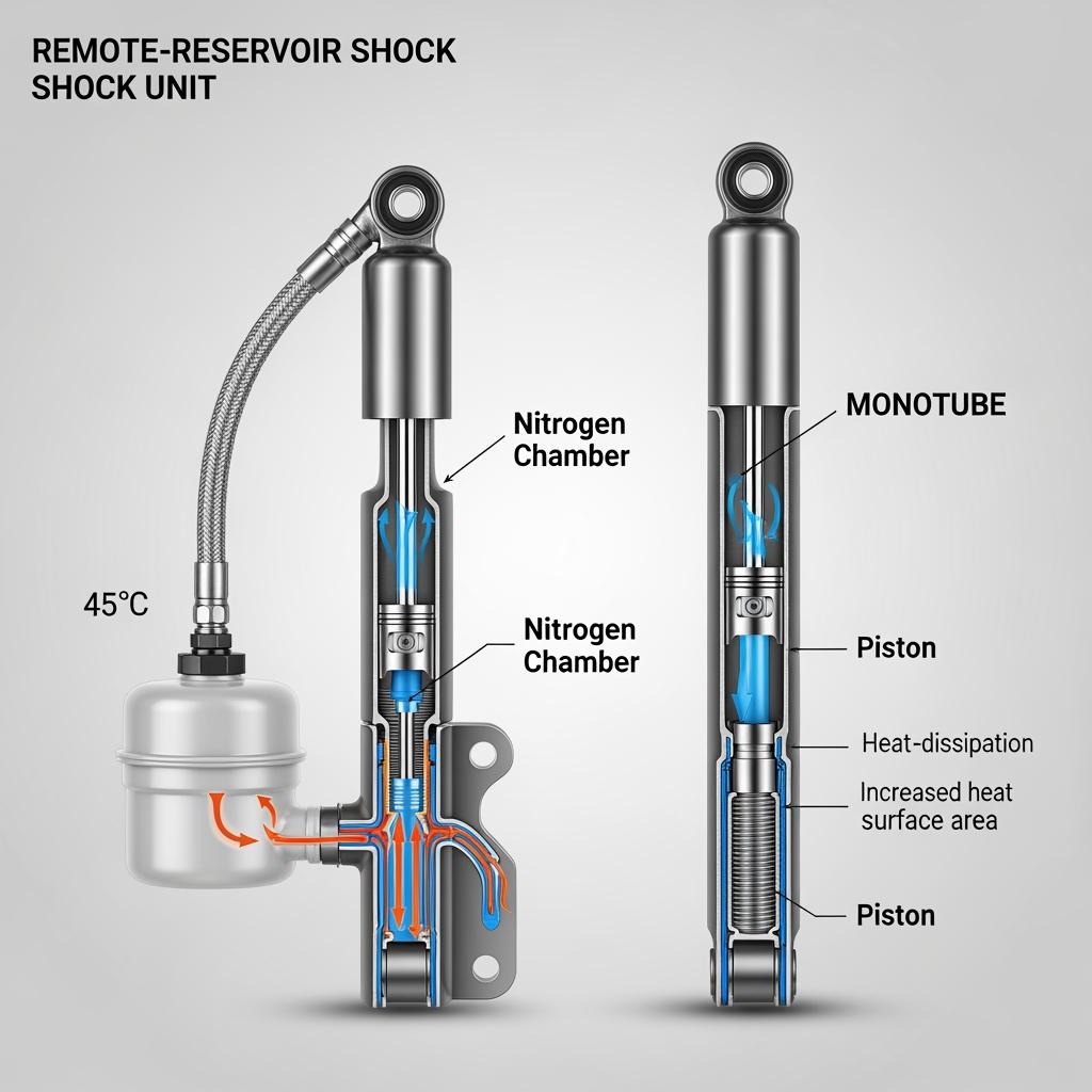 Remote-reservoir or bypass shocks perform best on dunes thanks to superior cooling and position-sensitive control. Monotube HD is a cost-effective option for mixed-use fleets.