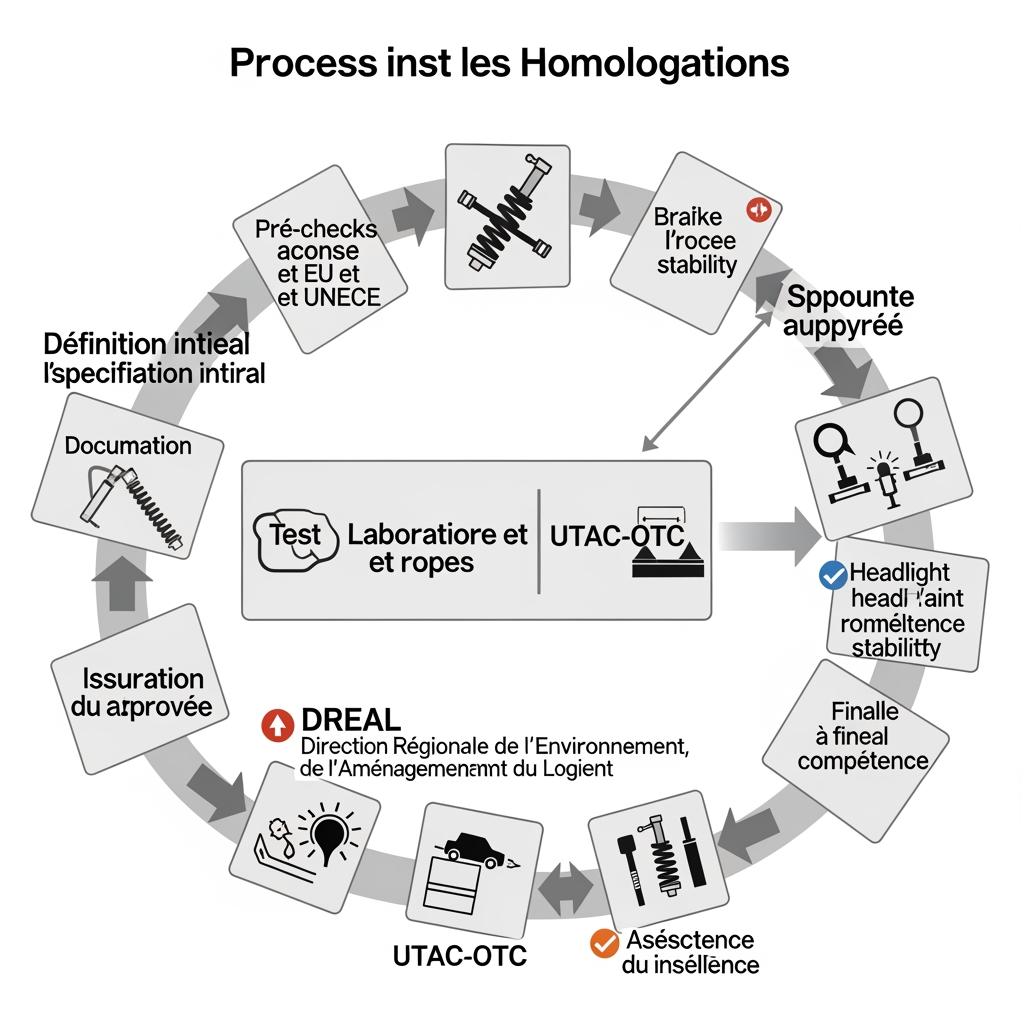 Your dossier should combine design evidence (materials and process traceability), dynamic test curves (from a shock dyno), corrosion resistance data, and on-vehicle checks proving that braking, steering, and lighting remain conforming. Clear, French-language documentation speeds DREAL appointments and reduces back-and-forth.