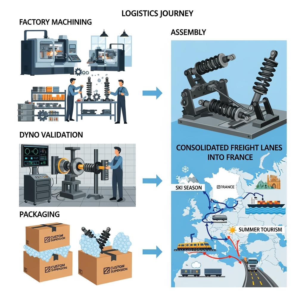 French distributors and installers need reliable fitment, repeatable dynamics, and a supply chain that handles demand spikes around ski seasons and summer travel. A solid B2B program includes SKU mapping by VIN or chassis code, clear lift envelopes per tire size, dyno-validated damping curves, and boxed kits that include ancillary parts—top mounts, alignment bolts, sway-bar links, brake line brackets, and torque specs. On the commercial side, shared forecasts, buffer stock for fast movers, and packaging in French/English reduce returns and install time.