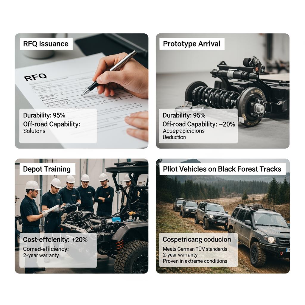• Define use cases and KPIs → issue RFI with vehicle/payload/route data → shortlist suppliers with matching test capability → request A/B prototype sets with dyno curves → run instrumented route tests in Germany → select spec → pilot 10–20 vehicles → review driver feedback and telemetry → release to fleet with spares plan.