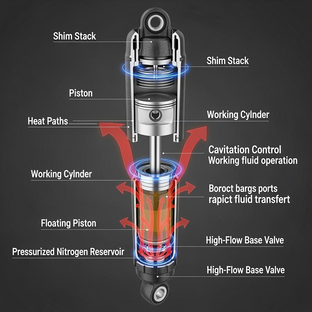 • Choisissez amortisseurs monotubes ou à réservoir avec surface de piston et volume d'huile suffisants pour éviter la surchauffe sur descentes longues ou pistes corrugées.