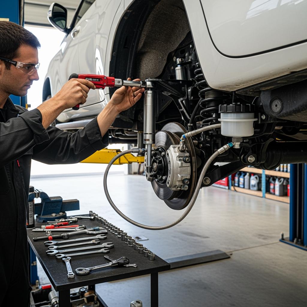 Start with a clean bay and shaded environment to avoid dust contamination. Step 1—inspect → verify the vehicle is safely supported, torque old fasteners for removal, and note existing ride height at each corner. Step 2—remove → back out fasteners, support arms, and capture OE hardware if reused; inspect mounts for ovaling or cracks. Step 3—prep → clean mounting faces, chase threads, and dry-fit the new damper to confirm clearance around brake lines and reservoirs.