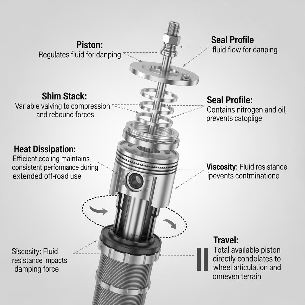 Off-road shocks use stronger shafts, elevated oil capacity, and tuned valving to manage heat, cavitation, and long-travel events like whoops and washboards. Seals and wipers are also specified for dirt and water ingress.