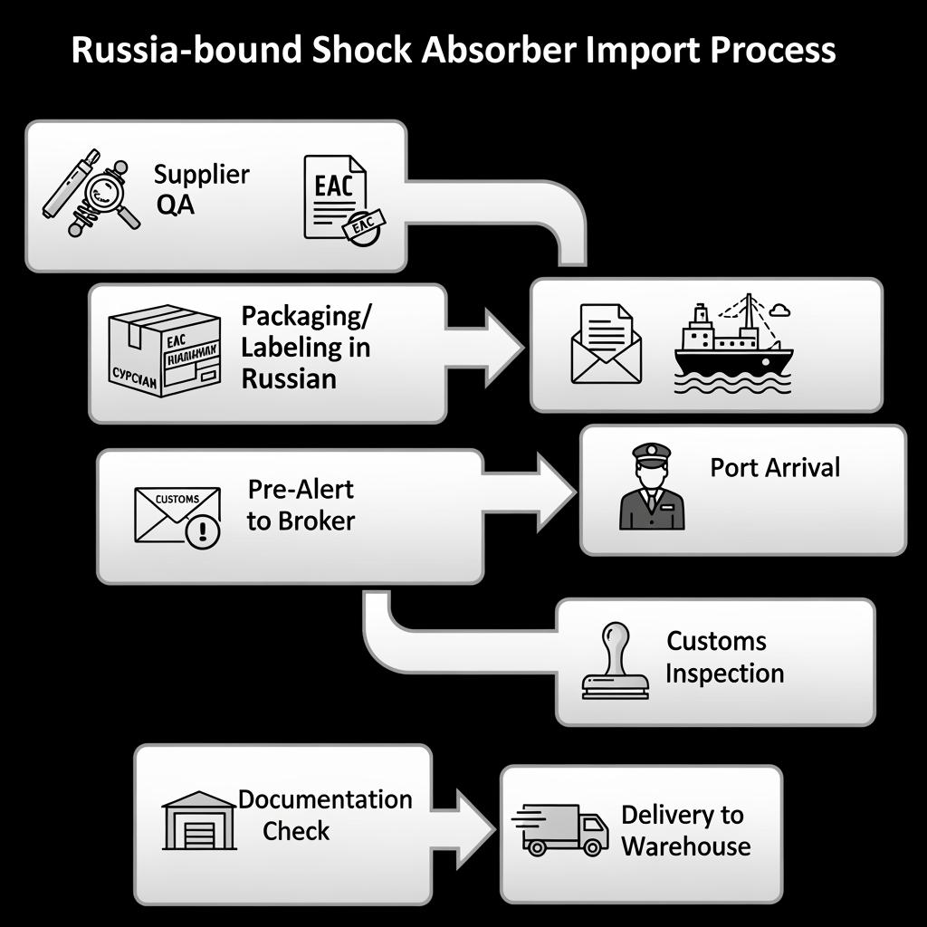 Getting documentation right prevents surprise costs and dwell-time. Most SUVs and light-truck shock absorbers fall under HS Code 8708.x; importers should confirm the precise subheading with a broker based on construction and application. EAC compliance under TR CU 018/2011 typically applies to automotive components; depending on the end use, you may need declarations, test protocols, and Russian-language labeling.