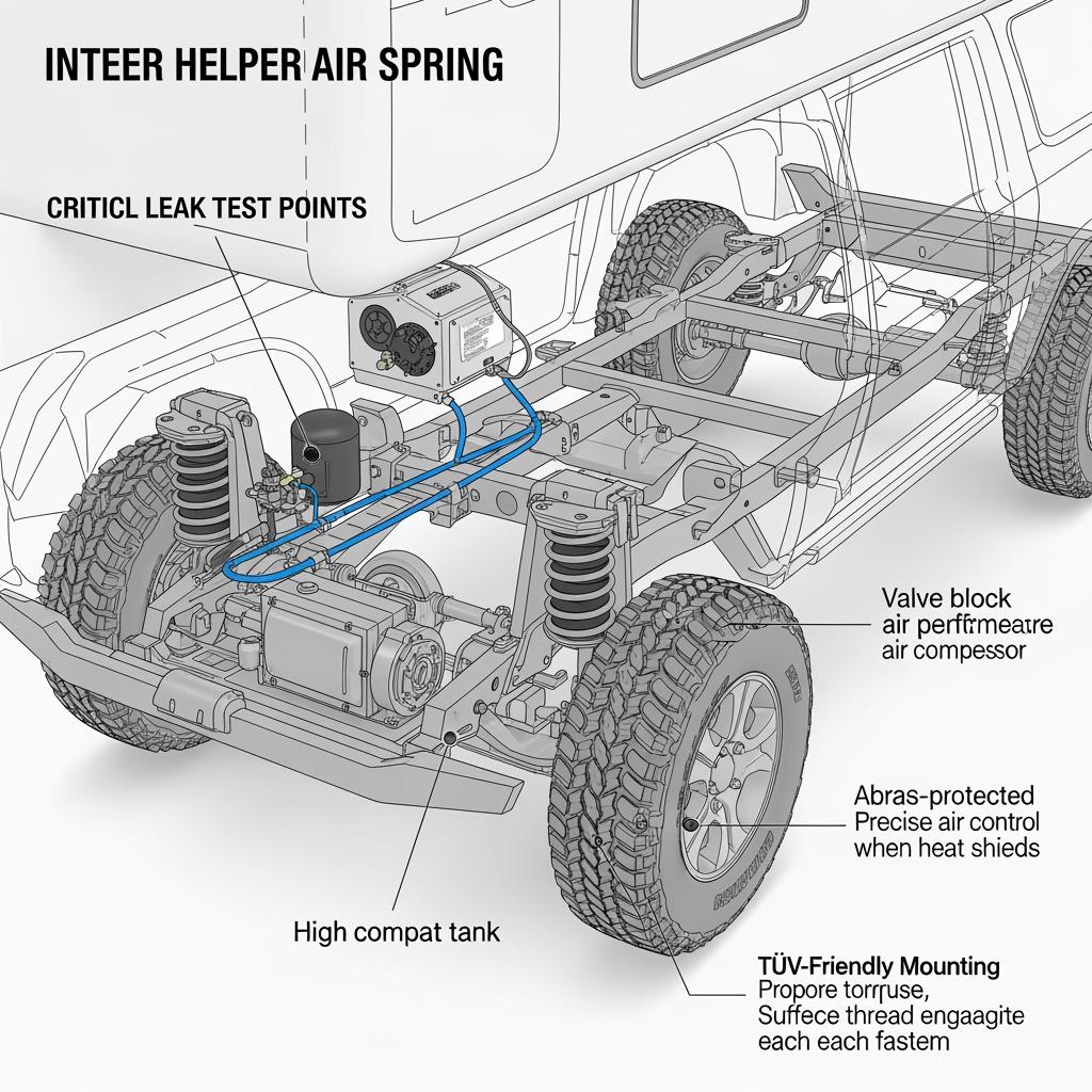 Air systems shine for load-levelling and campsite leveling, but they demand disciplined engineering and documentation to pass TÜV. Size air springs for axle loads with margin, route lines away from heat/chafe zones, and ensure fail-safe support at bump stops should pressure drop.