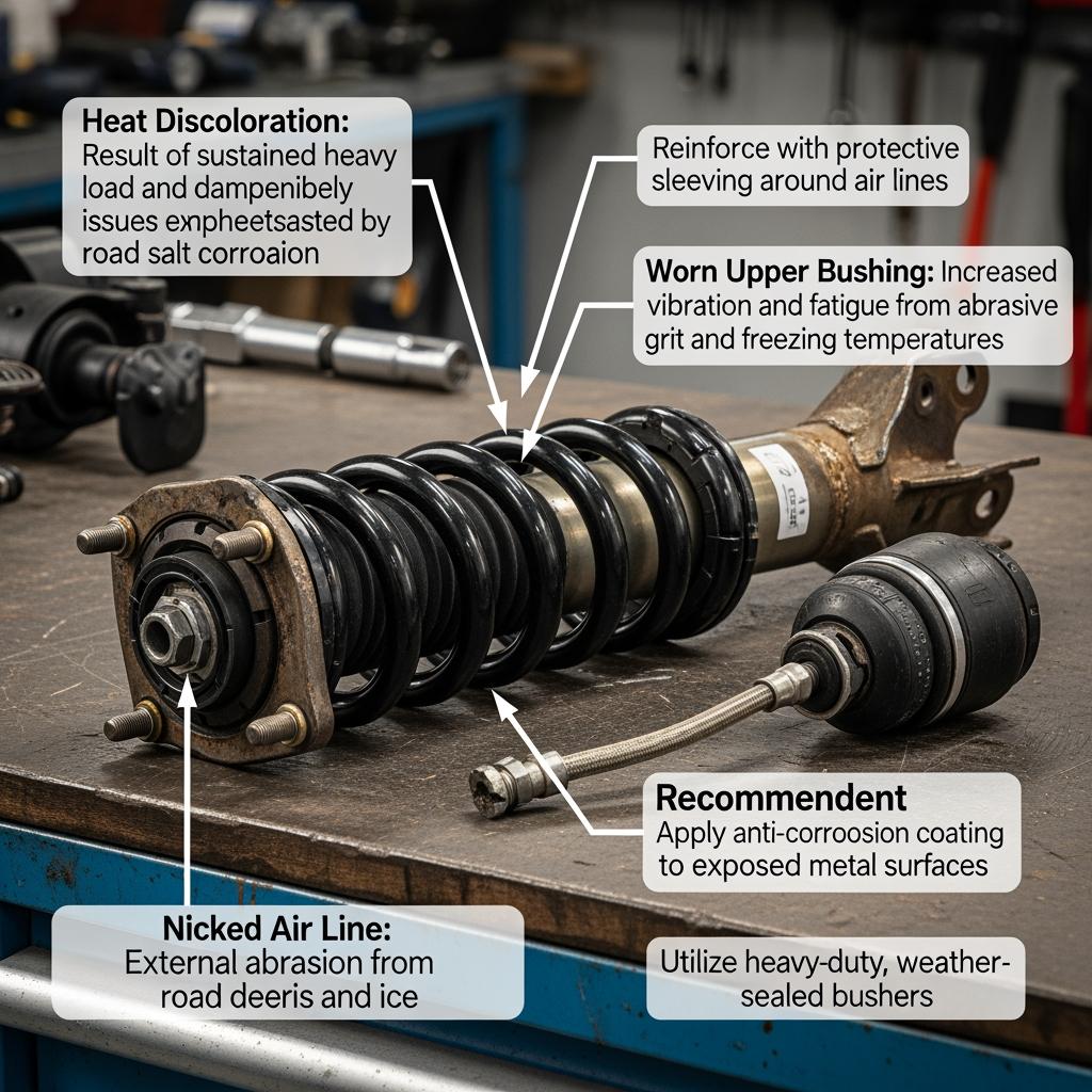 | Air leak | Sag overnight; compressor cycles often | Fitting/line nick; bag damage | Soap test fittings and bag folds | Trim/re-seat line; swap fitting | Reroute with sleeves; add better brackets and strain relief |