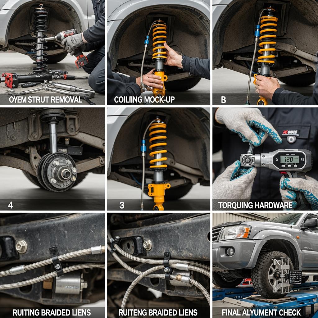 - Install and torque → check. Fit dampers and coils/coilovers to spec using a calibrated torque wrench; add thread locker where the manufacturer specifies.