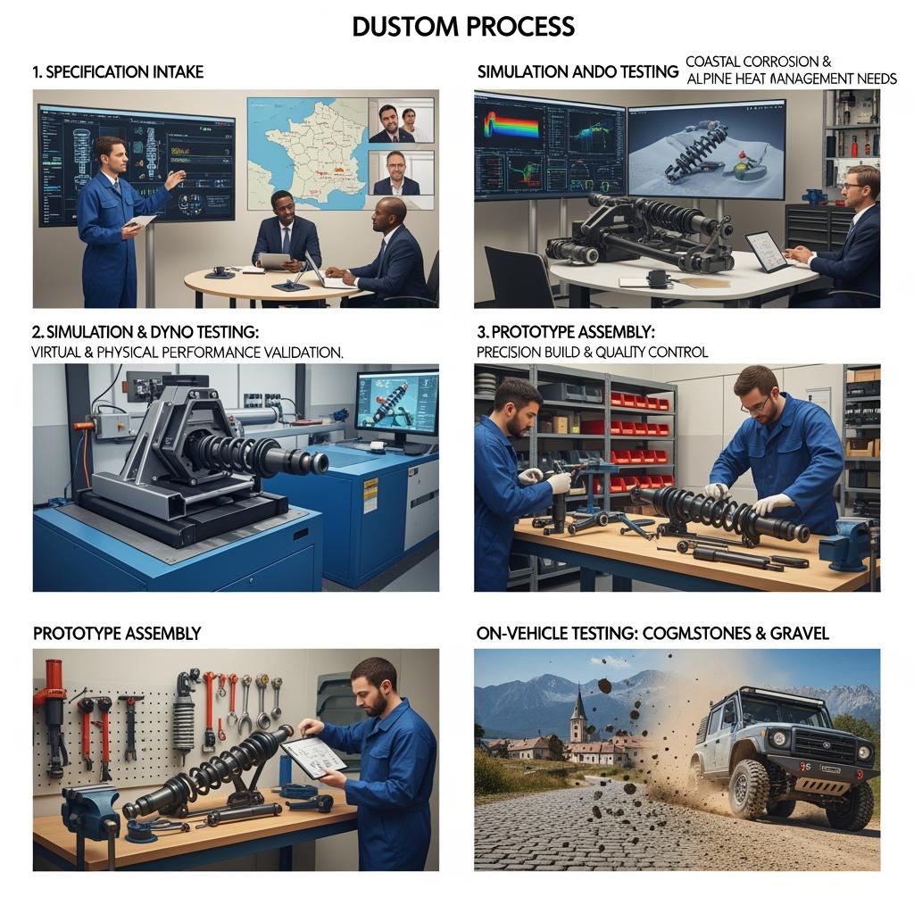 If you assemble or upfit SUVs locally, custom valving and spring rates beat generic kits. A proven path is: share spec → simulation and dyno curves → prototype fit → instrumented pilot → driver feedback loop → SOP release. Use curb weight, front/rear static load, CG height, tire spec, and mission profile to set your design envelope. In France, add corrosion lifecycle targets and a cold/wet performance window to your DVP (Design Verification Plan).