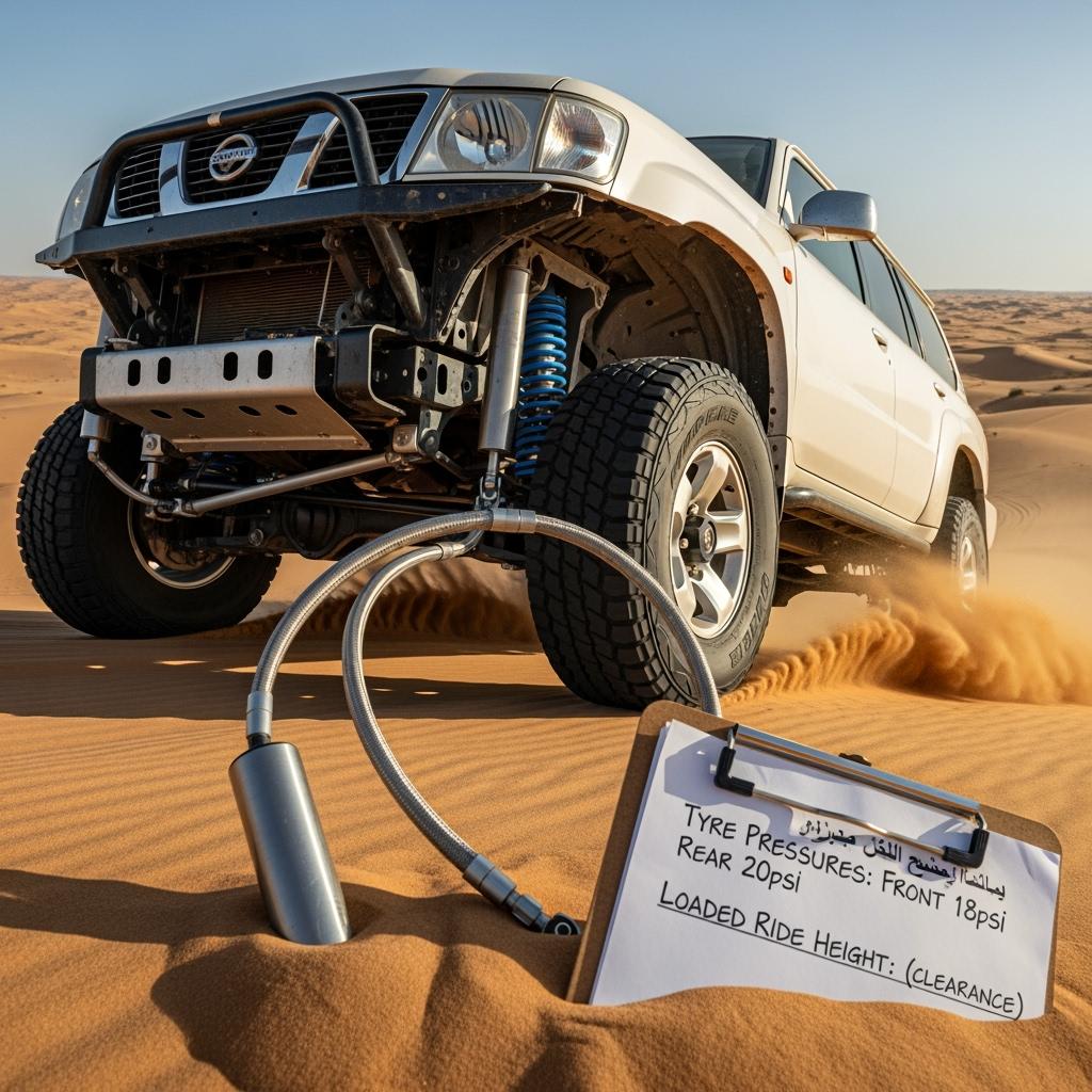 グランドクリアランス向上のため25〜50mm軽度リフトを想定し、CV角度健全維持。砂丘頂上大圧縮用プログレッシブバンプストップまたは内部バイパスゾーンを採用。排気近傍熱吸収・石命中回避ホースルーティングを優先。キット安定後アライメント再確認;小キャスタ補正で高速安定が劇変。