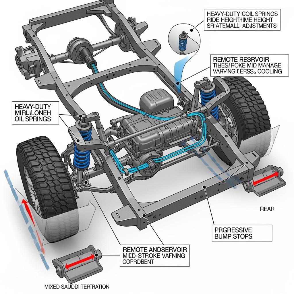 サスペンション性能はシステムレベル:スプリング、ショック、バンプストップ、ブッシュ、ジオメトリが相互作用。サウジアラビアでは軟砂丘のフローテーション・安定から岩場トラックの可動域・ボトムアウト保護まで極端。実ペイロード向けスプリングレートを選択し、過熱せずタイヤ接地を維持するダンピングカーブと組み合わせ。
