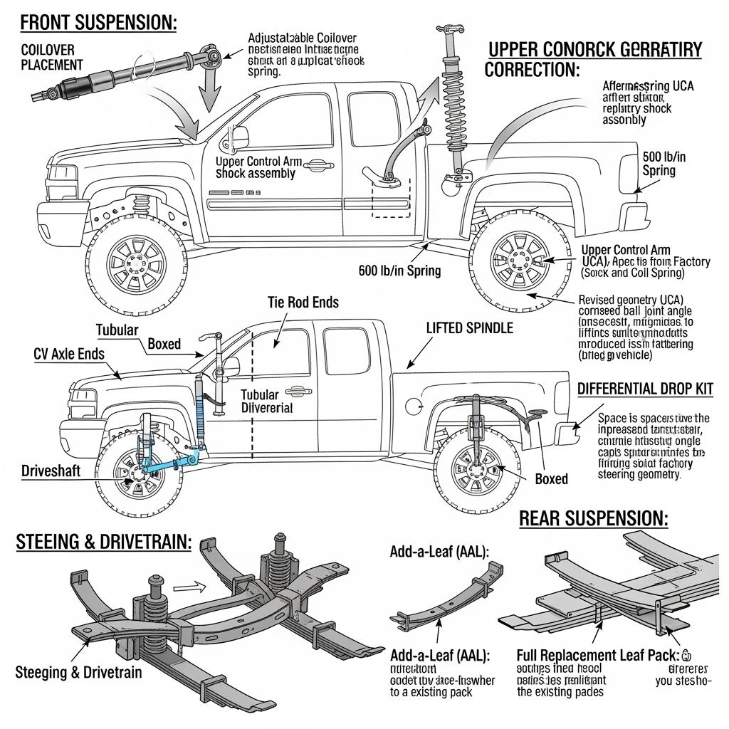 When choosing between spacer, coilover, or full system lifts, think in terms of the ride zone you’ll actually use. Spacer-only lifts raise height but don’t add damping headroom. True coilover systems with matched rear leaf/coil packs improve both height and control. Add bump stops and extended brake lines to keep impacts predictable and service intervals manageable in the heat.