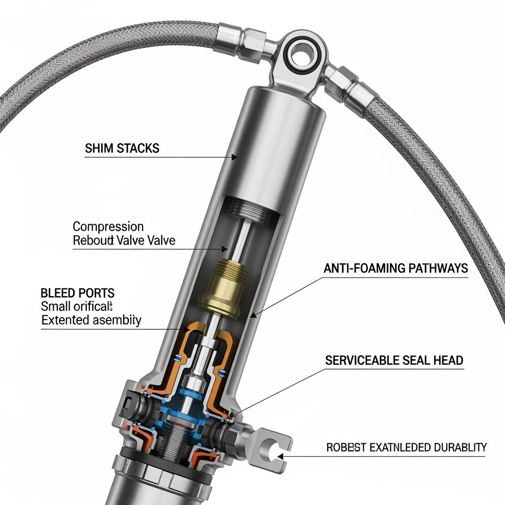 • Measure damping needs → check oil volume. If descents last >10 minutes with frequent braking, specify reservoir to extend fade resistance.