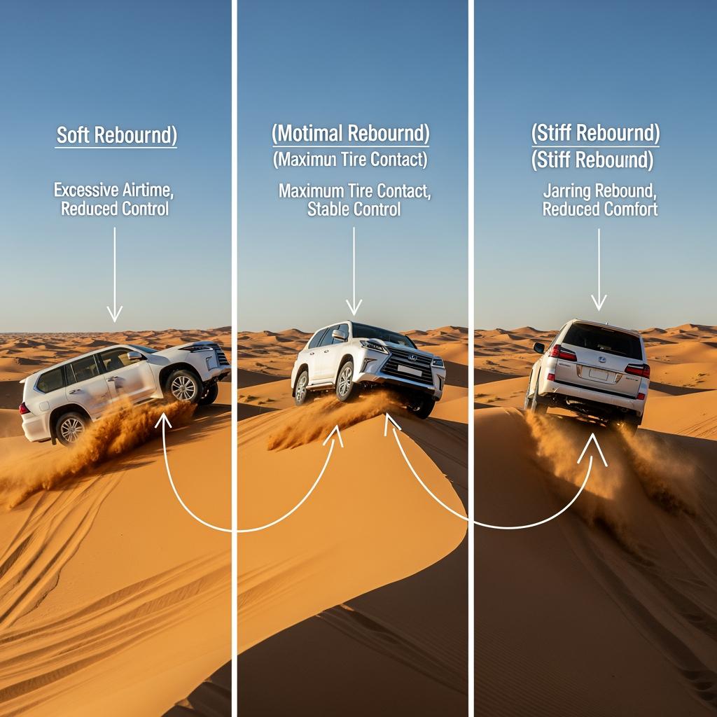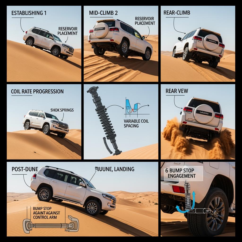 | All-round desert pack (Tuned Suspension Systems for Desert Off-Road Vehicles in Saudi Arabia) | Low: medium; High: medium-firm | Medium-fast with progressive tail | Progressive coils or dual-rate where applicable | Travel-friendly baseline; fine-tune based on tire size and roof load. |